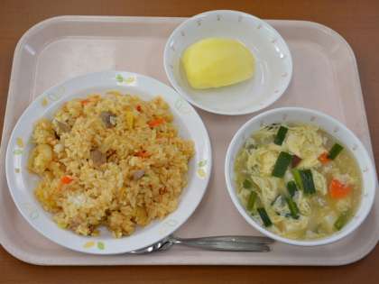 キムチチャーハン 牛乳 にらたまスープ りんご