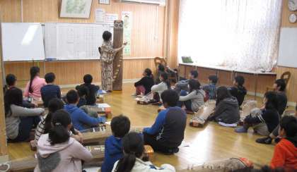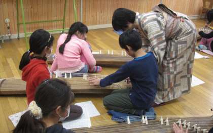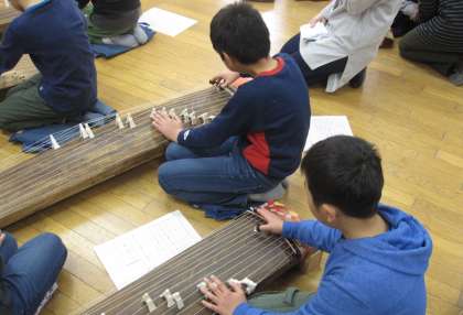 地域在住の音楽家をお招きし、プロの音楽演奏に親しむとともに、子どもたち自身、箏の歴史を学び、演奏を体験しました。始めに、箏と琴の違いや箏という楽器は奈良時代に中国から伝来したことや「龍角」「龍尾」などの箏の各部分の名称を教えていただきました。次に『桜』の演奏に挑戦しました。1時間程の体験で、上手に弾けるようになった子もいます。