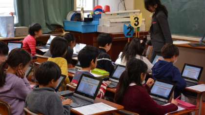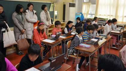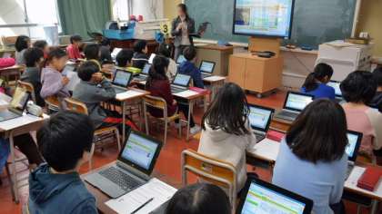 後半は場所を変えて、パソコンからネット上の百科事典を使って、調べたい項目をさがす方法について学びました。今年度途中から導入されたタブレットとしても使えるパソコンを一人一台、無線でネットとつないで使用しました。