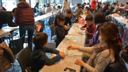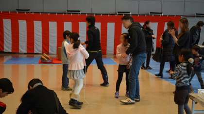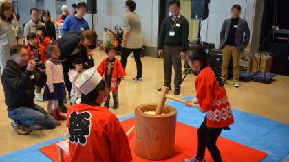 ライズのITSCOMホールでは、コマ回しの体験があり、期のコマに色づけをした後、みんなでコマ回しに挑戦です。大人も結構楽しんでいました。最後に餅つきも体験させてもらい、楽しいひとときをすごしました。