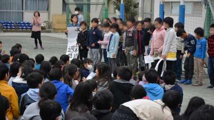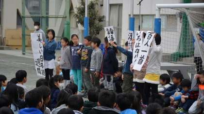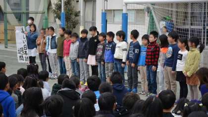 今週は「美しい日本語週間」なので、校長講話の後、教科「日本語」の推進担当者が担任している4年2組の子どもたちが、みんなに呼びかけました。最初に北原白秋の詩「からまつ」を暗唱したあと、今週の活動内容について説明しました。みんなの前でしっかり発表できて、素晴らしかったですね。