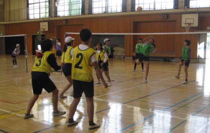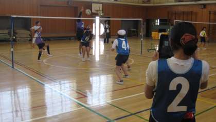 ソフトバレーボールの学習を始めました。5年生からの学習を発展させ、6年ではルールを工夫して、革製のボールを使ってゲームをします。タブレットPCを使って、自分たちのチームの様子を撮影し、課題を明確にして、めあてを立て、練習をしたり作戦を立てたりして授業を進めていきます。チームの仲間と一緒に、ソフトバレーボールのゲームを通して学びます。アクティブラーニングを体育科の授業で実践しています。