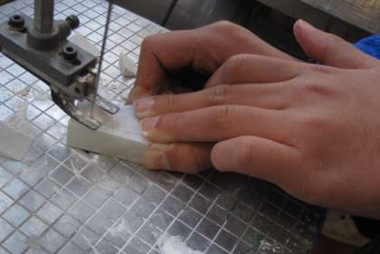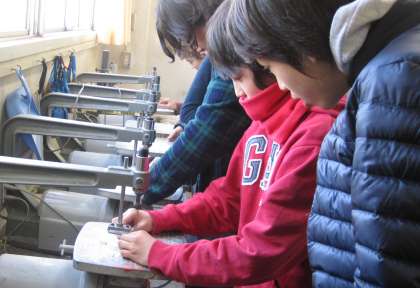 「勾玉づくり」に挑戦しています。始めにデザインを考え、糸のこぎりを使って大体の形に切ります。その後でやすりで削り、丸みを作っていきます。黙々と取り組んでいる姿が印象的でした。心を込めて作った作品は、一生の宝物になりそうです。