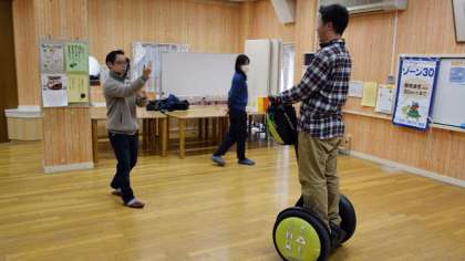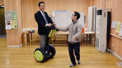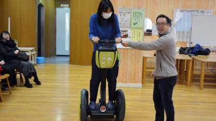 式典の後で、セグウェイの試乗会も行っていただきました。本校職員も参加し、インストラクター資格を持つ方の指導で、あっという間に乗れるようになりました。楽しかったですよ。今後地域では、許可をとって路上でセグウェイを使った交通安全啓発活動を行う予定です。楽しみですね。