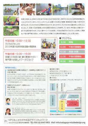 明日14日(日)、二子玉川ライズオフィス8階の「東京都市大学二子玉川夢キャンパス」で、NPO法人せたがや水辺デザインネットワーク主催の、「多摩川子どもシンポジウム」が開催されます。午前10時からは、区内の多摩川沿いの学校や児童館などが活動報告をします。本校も発表の1番目に、5年生児童3名と4年生児童1名が、愛鳥活動について発表します。参加無料ですので、ぜひ、お出かけください。13時30分からの午後の部では、多摩川について専門家のお話とワークショップが行われます。関心のある方は、こちらにもご参加ください。