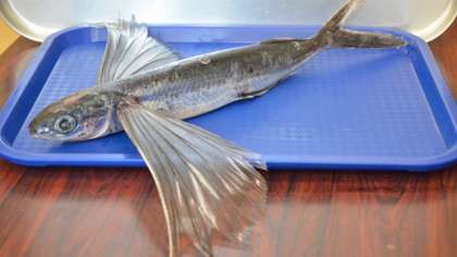 ※八丈島から届いたトビウオです。(残念ながら生ではなく冷凍したものですが、解凍して1年生の子どもたちに見せました。