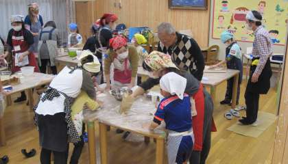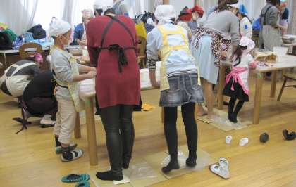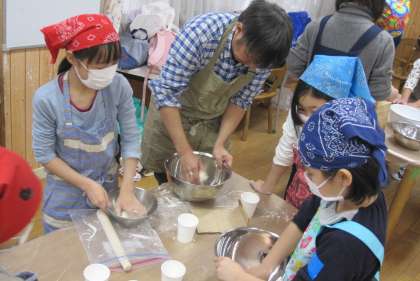 いよいようどん作りの開始です!はじめに、粉に塩水を少しずつ混ぜてこねます。とても力のいる作業です。粉がしっとりとしてまとまってきたところで、ビニール袋に入れて踏みます。食べ物を踏むという作業に、少しためらっている子どもたちもいました。こしのある美味しいうどんをつくるには、大切な作業になります。