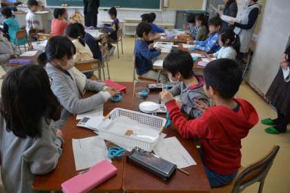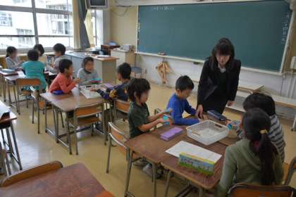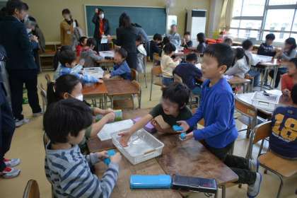 それでは、今日の授業の様子を見ていただきましょう。3年生の「ものの重さ」の授業です。手にべとつかない粘土を使って、同じ重さの粘土でも、形を変えて手に持ってみると重さが変わったように感じます。このことから、形が変わると重さが変わるのではないかという問題を導き出し、電子てんびんを使って実際に計量してみるとともに、さらに自分なりに考えた形に変えて、念を押して調べるという学習です。素直な反応と、探求意欲あふれる子どもたちのようすが見られました。