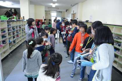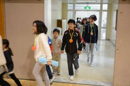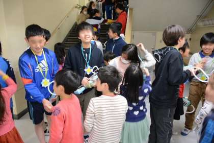 3日(木)3、4校時、体育館で児童会代表委員会が主催して、「6年生を送る会」が行われました。会が始まる前、体育館に続く廊下で、1年生から手作りのメダルを送ってもらってうれしそうな6年生です。入場の合図が出て、1年生と手をつないで体育館に向かいました。