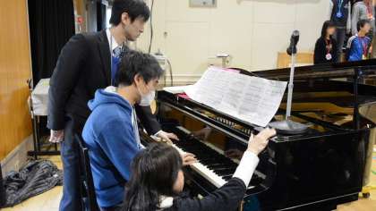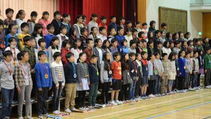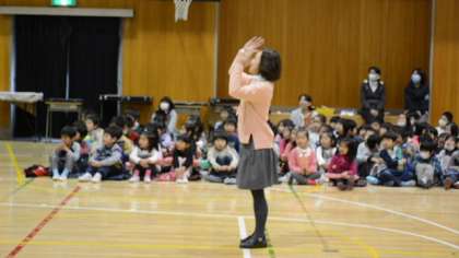 さあ、みんなからの出し物のお返しとして、6年生の出し物です。最初は「ふるさと」を歌いました。担任の先生たちも頑張りました。ご覧のように、なんとピアノ伴奏と指揮を担当しました。