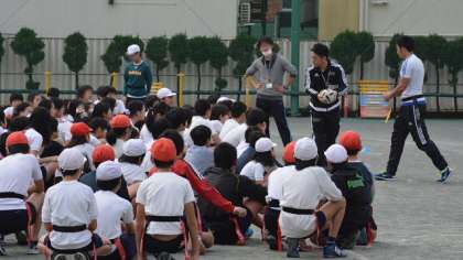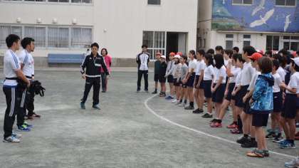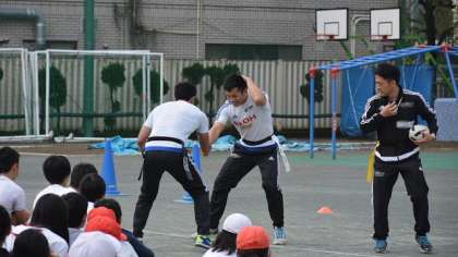 8日(火)、6年生がキャリア教育の一環として、ラグビートップリーグに属している「リコーブラッグラムズ」の選手をお招きして、ラグビーの体験授業とお話を聞く会を行いました。1校時、校庭でラグビー体験授業です。ワールドカップでの日本代表チームの活躍以来、ラグビーの認知度は上がり、子どもたちも最初から興味津々です。しかも、トップリーグで活躍中の現役選手が3名も来てくださり、小学生でもできるタグラグビーを指導してもらって、その体格の良さや技術に、歓声やため息がわき上がっていました。
