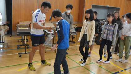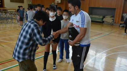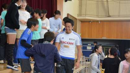 会が終わって、選手が子どもたちに取り囲まれて、帰るときには名残惜しそうでした。地元チームとして応援したくなった子もたくさんいたようです。このような機会を提供してくださった、リコーラグビー部「ブラックラムズ」の皆さんに改めて感謝いたします。