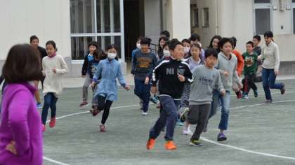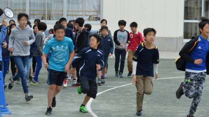 10日(木)、5・6年の体育朝会を行いました。今日は朝から曇り空で気温も低く、冬に逆戻りといった日になりましたが、子どもたちは元気に3分間走を行いました。