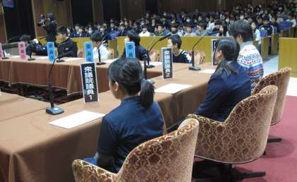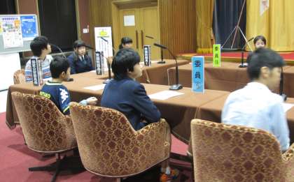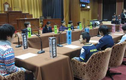 中学生と他校の6年生と3校合同で、参議院特別体験プログラムに参加しました。それぞれの学校の代表者が「委員会の審査」と「本会議の審議」をセリフを述べながら、本番さながらに体験しました。全体の場でマイクを通して堂々と言葉を述べている姿に感心しました。