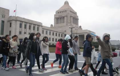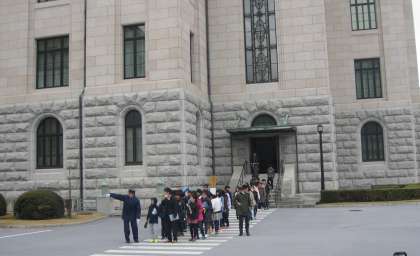 参議院から衆議院へ移動し、国会議事堂の中を見学しました。豪華なつくりに子どもたちは声を上げて感動していました。見学を終え外へ出ると長い列ができていました。内閣総理大臣が国会議事堂から出発するということで、しばらくの間待っていました。たくさんの車に囲まれて総理が出られると、6年生もバスに向かいました。副校長は、6年生のバスを見送り、校長とバトンタッチです。江戸東京博物館で千葉校長が待っています。