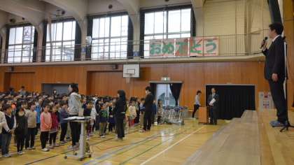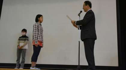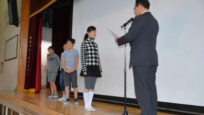今日の朝会では表彰を2件行いました。ひとつめは、6年生の健康努力児童の表彰です。6年間欠席0の児童と、ずっと半袖半ズボンで薄着を心がけた児童を表彰しました。無理は禁物ですが、何事も続けることは大事ですね。二つ目の表彰は、書写の作品が都の展覧会に出品された児童の表彰です。自分の得意分野を発揮して活躍している子を、これからも表彰していきます。最後に看護当番から、今週の目標「教室をきれいにして次の学年に渡そう」について話して、朝会を終えました。