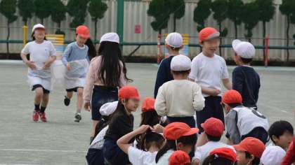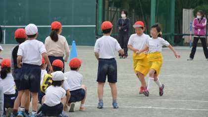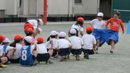 最後の種目はデカパンリレーです。春の運動会で行った種目です。2人3脚の要領で、ひもで足首を結ぶ代わりに、デカパンを2人ではいてリレーをします。一緒になった友達と息を合わせて、とってもスピーディーなレースが繰り広げられました。みんな成長していますね。2年生のまとめとして、楽しい時間が過ごせました。