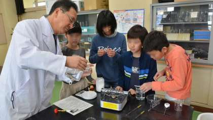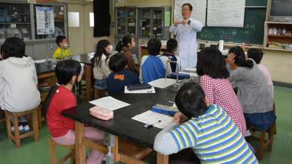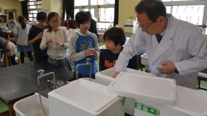 100mLnoビーカーに、まだ暖かいミョウバン水溶液を注ぎ、それに種になる結晶をつるし、保温用の発泡スチロールの箱に入れて実験は終了です。3組の子どもたちも、みんな協力してしっかり実験ができました。明日が楽しみです。