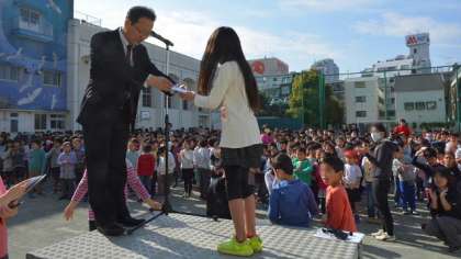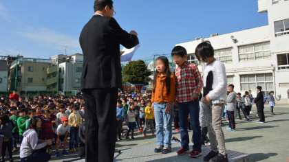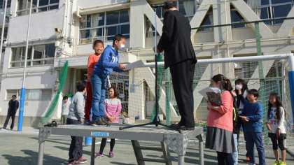 続いての表彰は、愛鳥検定合格者です。なんと総勢100名を超える合格者が出たので、クラス代表に賞状を手渡しました。さすが愛鳥モデル子の子どもたち。みんな鳥に詳しいですね。