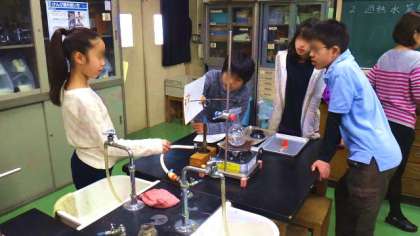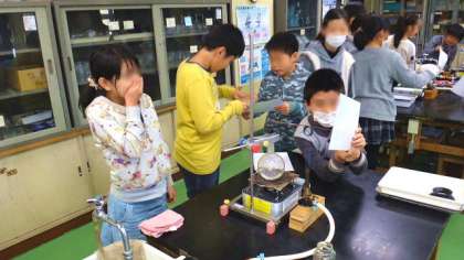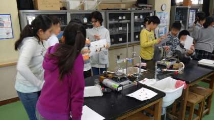 4時間目は過熱水蒸気実験です。グループごとに実験しました。準備や実験進行も協力し合って進めました。その成果が出てみんな大成功。水蒸気で紙を焦がして大喜びです。この実験で、水蒸気が気体だということも、改めて認識できたようです。中学でも考える力をはぐくむ実験に積極的に取り組んでほしいと思います。