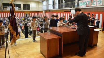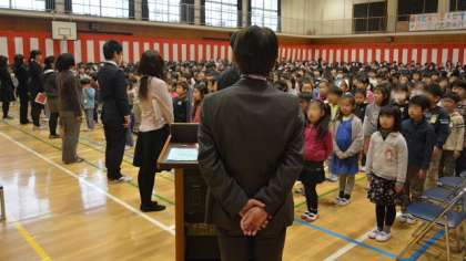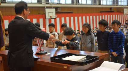 24日、平成27年度の修了式を、1〜5年生が参加して体育館で行いました。体育館は卒業式のいすなどの準備がしてあるため、当初の予定では校庭で行うはずでしたが、小雨がぱらついていたため、急遽5年生の児童が体育館のいすを壁側に片付けて行いました。各クラスの代表が舞台にのり、修了証を手渡しました。体育館で行う修了式は、やはりおごそかな雰囲気があって、一年間の締めくくりとしてよかったと思います。