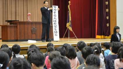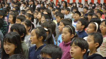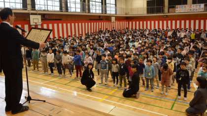校長講話では、作家の井上靖さんの言葉、「努力する人は希望を語り、怠ける人は不満を語る」を引用して、来年度に向けての前向きな気構えについて語りました。今年度みんなで歌う最後の校歌は、ひときわ声高らかに体育館に響きました。最後に、東京都から本校が「体力向上推進優秀校」として表書されたことを伝え、子どもたちのこの1年の努力をたたえました。