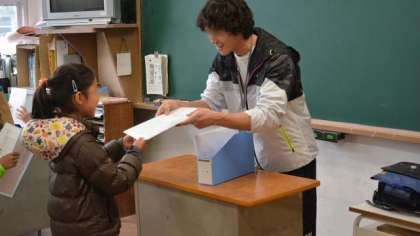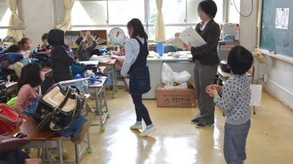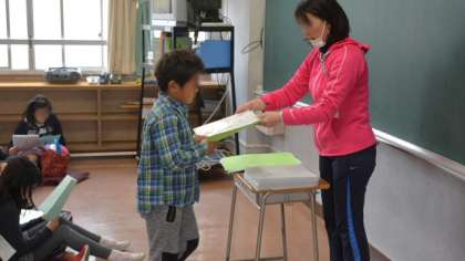 通知表をていねいに一人一人手渡しするのは、どのクラスも同じです。担任からのメッセージが込められています。