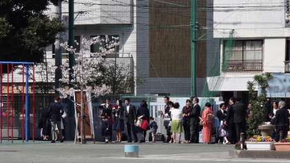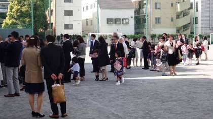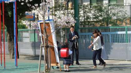 4月6日、始業式の後に入学式が行われました。天候にも恵まれ、春の日差しが温かい校庭に、新入生と保護者・家族の皆さんが次々に訪れました。校庭の桜の木の看板前では、受付前に記念撮影をする姿も・・・。
