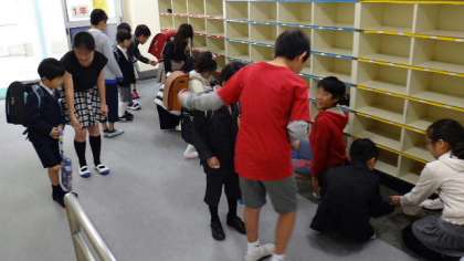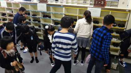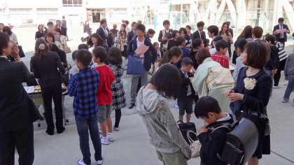 今年度は131名の新入生です。受付を済ませるとご家族の皆さんは会場の体育館へ、新入生は6年生の案内で靴箱で履き替え、教室に向かいます。