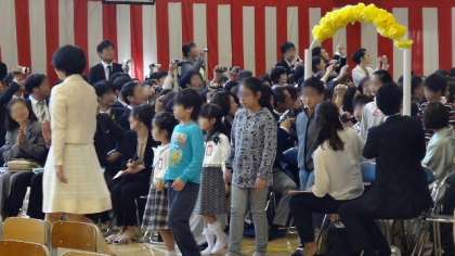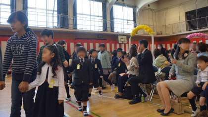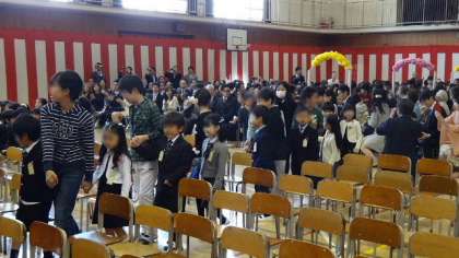 会場に保護者ご家族の方が参列し、予定の10時より少し遅れてご来賓の皆様が入場。いよいよ入学式の始まりです。新入生が在校生代表で参列する6年生と手をつないで、大きな拍手に迎えられ入場します。