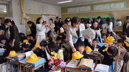 入学式終了後、教室で担任の話を聞いたり、配布物の確認を保護者の方にしていただいたりしました。入学式の緊張感からうって変わって、ちょっとなごんだ雰囲気です。