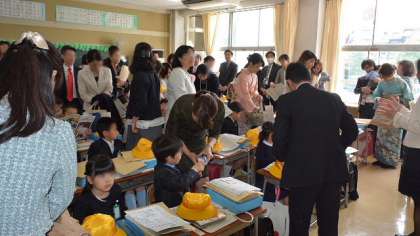 各学級での話の前と後、クラスごとに体育館に戻り、保護者・家族の皆さんと一緒に記念撮影をしました。1組の記念撮影のようすです。
