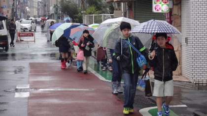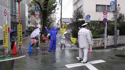 雨が降りしきる中、子どもたちが元気に登校してきます。交通安全運動期間中ということもあって、交差点には警察の方も立ってくださいました。また、いつもの交通安全ボランティアの皆さんと保護者の旗振り当番の皆さんに見守られています。