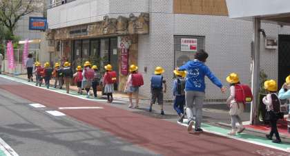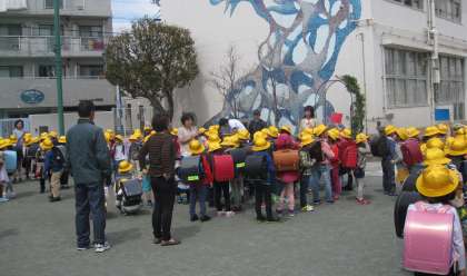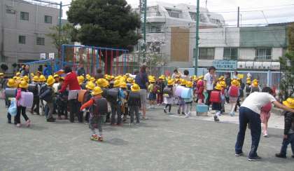 色別のコースごとに、1年生全員が校庭に並びます。安全に下校ができるように、しばらくの間は担任、専科教諭、学校主事、支援員、大学生ボランティア、保護者に見守られながら帰ります。