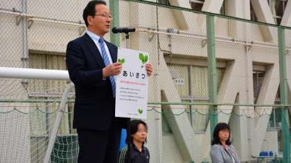 整列の合図もいつもより時間をかけて丁寧に行いました。どの学年もきちんと並び、6年生のあいさつ当番が前に出てきて、校庭中に響く元気な大きな声で「おはようございます」と声をかけました。おかげで初めての1年生もしっかりとあいさつできました。今年度のスタートは上々です。校長講話は、「あいさつ」について話しました。