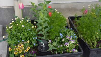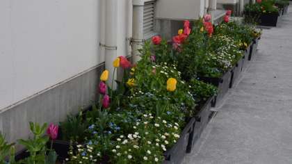 は昨年5月から10月まで、体育館西側の壁面を鮮やかな緑色で彩ったクリーンカーテンですが、11月にネットを外し、プランターには春に咲く花をたくさん植えました。それが今や花真っ盛り。校庭を彩っています。