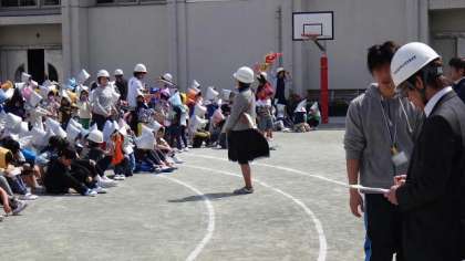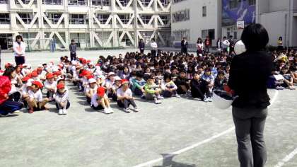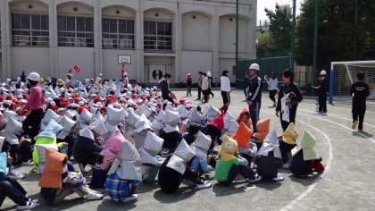 何事も最初が肝心。避難のルールや基本的な行動について、しっかり指導しました。人員点呼など、教職員もいつにもまして真剣な態度を子どもたちに見せました。校長の話はマイクなしで行いましたが、全校児童がよく聞いいていました。初回としてすばらしいと思いました。1年生も初めての参加でしたが、しっかりできました。
