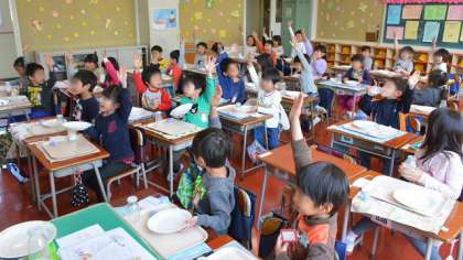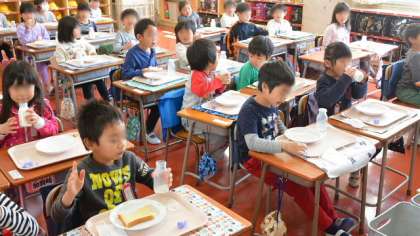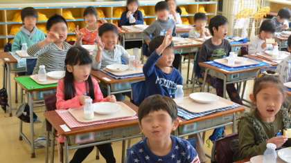 12日(火)、今日は1年生にとって学校で食べる初めての給食です。・・・といってもまだ最初なので、他の学年で出ている、ビーンズシチューとツナサラダはまだ出ていません。はちみつレモントーストと牛乳というメニューです。みんな食べ終わったころに担任が「お代わりは}と聞いてみたところ、みんな手をあげてしまいました。