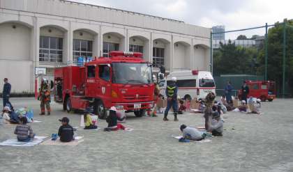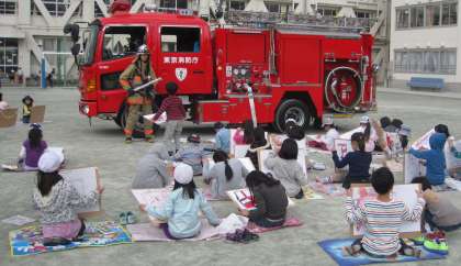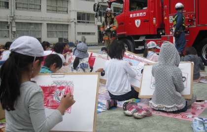 玉川消防署、玉川消防団第7分団のみなさんにお世話になり、「はたらく消防の写生会」を実施しました。校庭で2年生の子どもたちが、はしご車、消防団の車両、救急車を写生しました。近くで見ると迫力があります。「はしご車とゾウはどちらが重たいの?」「象の重さは、わからないけど、はしご車は8000キロもあるんだよ」「すごい!」子どもたちは消防士さんと会話を楽しみながら描いていました。本日描いた絵は、玉川消防署、本庁審査により優秀賞等が選ばれ、10月下旬に玉川高島屋S・C〜東急二子玉川駅連絡地下道に展示されます。
