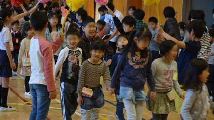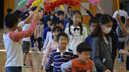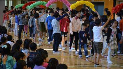 15日(金)朝、体育館で児童会代表委員主催で、「1年生を迎える会」を行いました。6年生がもつ花のアーチをくぐって、6年生と手をつないで1年生が入場です。