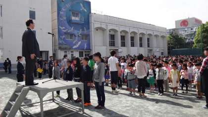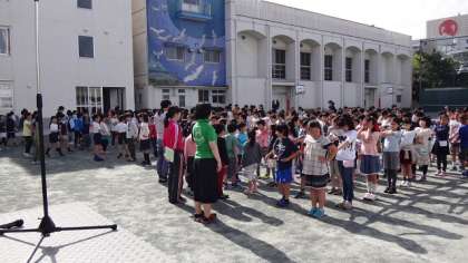 18日(月)朝会は、晴れ渡った空の下、校庭で行いました。高学年は他の学年が出てくる前に校庭に整列して、後から出てくる学年の模範になっています。さすがです。あいさつ当番の6年生とても元気な声であいさつをして、それを手本にみんながしっかりとあいさつできます。