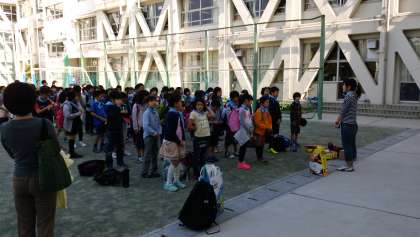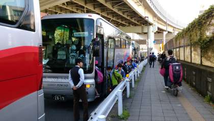 19日(火)、今日は4年生の遠足です。バスで昭和記念公園に出かけます。朝、校庭に集合した4年生。出発のセレモニーをして、元気に出発です。