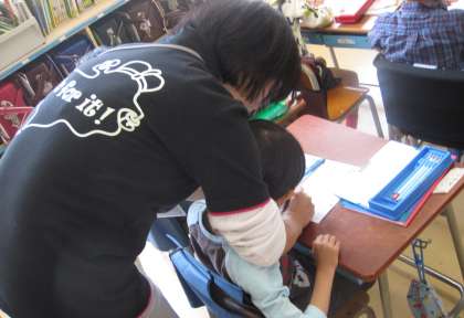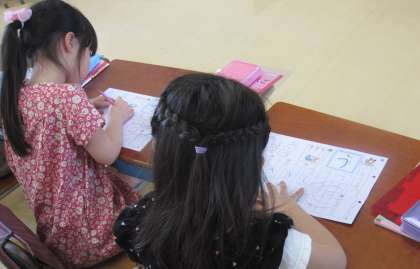 こくご「ひらがな」の学習をしています。一文字一文字ていねいに形を整えて書いています。鉛筆の持ち方、姿勢も意識して練習します。子どもたちの集中力に感心しました。先生からの花まるは嬉しいですね。