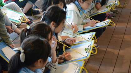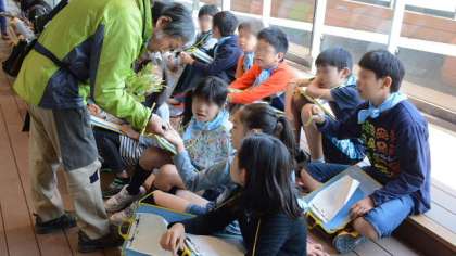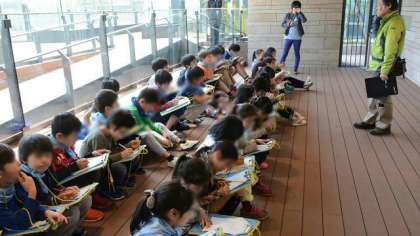 各クラスで30分ずつ時間をずらして出かけ、屋上ビオトープの生態系や自然観察のノウハウを学びました。熱心に学ぶ子どもたちの姿です。4年生は理科の季節の変化を学習するために、継続的に訪れ、観察をします。地元の施設ですから、ぜひご家族でも定期的に訪れて、自然の移り変わりに目を向けてみませんか。