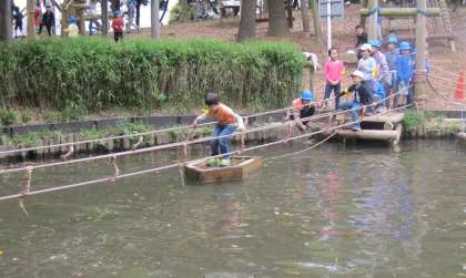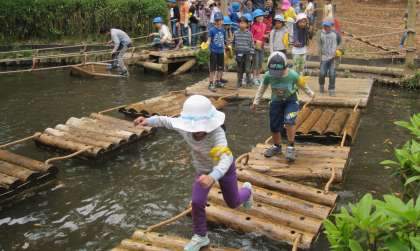 落ちたら大変!子どもたちの緊張感は高まります。友達が応援してくれます。やり遂げたときは跳びはねて喜んでいました。たまには、スリルを味わう経験も大切ですね。