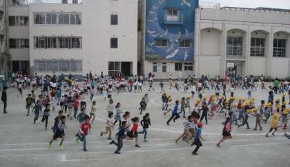 毎週、水曜日と木曜日の20分休み終了5分前に、音楽とともに準備運動の合図があります。子どもたちは、遊びをやめて運動の準備をします。校庭、体育館、屋上に分かれて、マラソン、縄跳びを行い、体力を高めていきます。