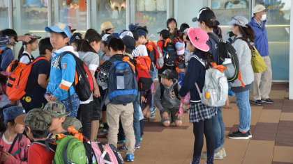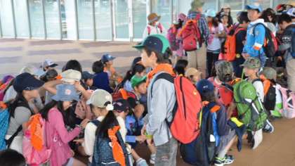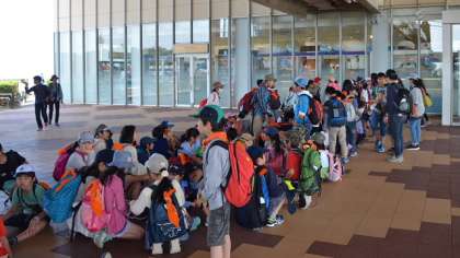 途中、道路が渋滞していて江ノ島水族館に予定よりだいぶ遅れて到着しましたが、水族館前に素早く整列して、さっそくグループごとに見学をしました。
