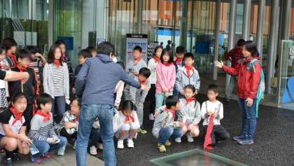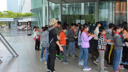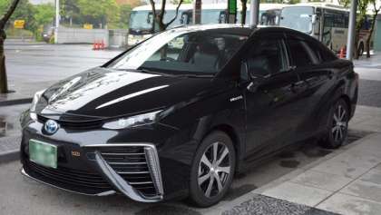 見学が終了して、科学未来館のエントランスのところでクラスごとに集合写真を撮影。バスに乗り込む途中のところで、燃料電池車のタクシーを発見。いつも館長さん(毛利衛さん)が使っているのだそうです。