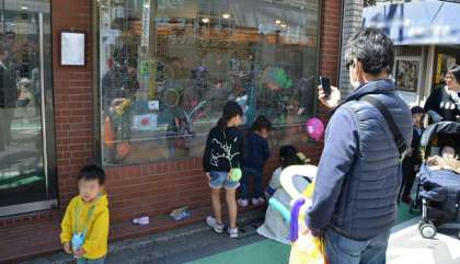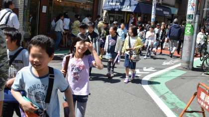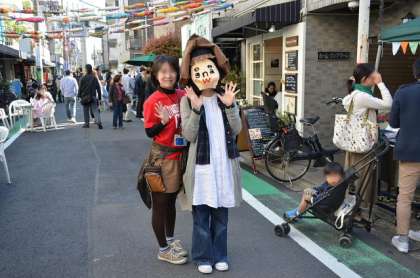 本校目の前の二子玉川商店街で行われている「アート&マート」にもたくさんの人が訪れていました。その中を合奏を発表する5年生が学校に集合した後、通って第1会場に向かいました。