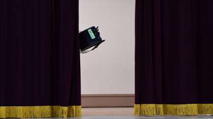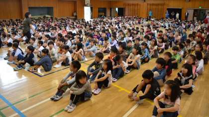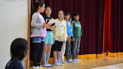 10日(火)朝、集会委員会の企画で、体育館に全校児童が集まってお楽しみ集会をしました。もの当てクイズです。舞台の膜の真ん中分を1mほど開けて、その間を飛んでいくものをあてる3択問題です。ちなみに下の写真は「ランドセル」ですね。